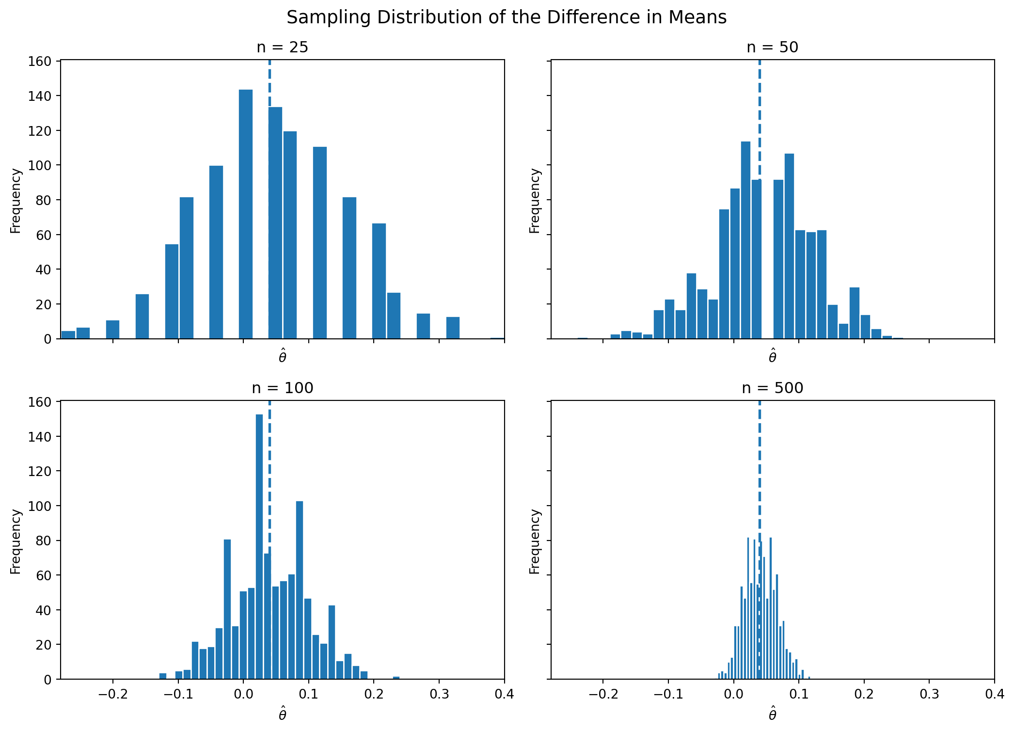 The Central Limit Theorem (CLT) tells us that, for sufficiently large samples, the sampling distribution of the sample mean becomes approximately Normal, even when the underlying data are not Normal. Since our estimator is a difference in sample means, the CLT suggests that the sampling distribution of \(\hat\theta\) should also become approximately bell-shaped as sample size increases.
