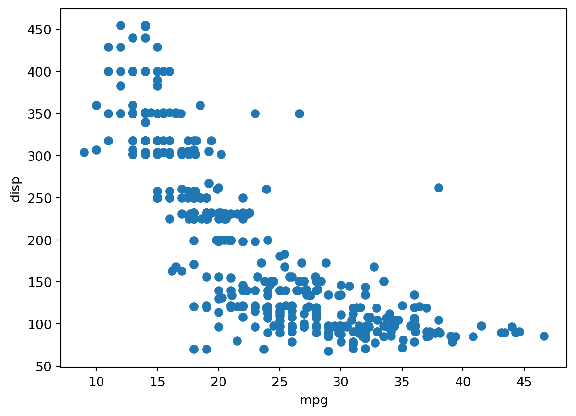 mpg) and engine displacement (disp) from the mtcars dataset. Those variables have a correlation of r…